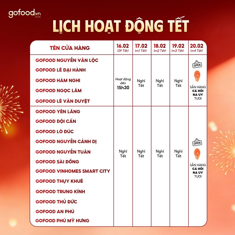 Mở bán khai xuân: Ngày 20/02 (Mùng 4 Tết): Toàn bộ hệ thống cửa hàng Gofood